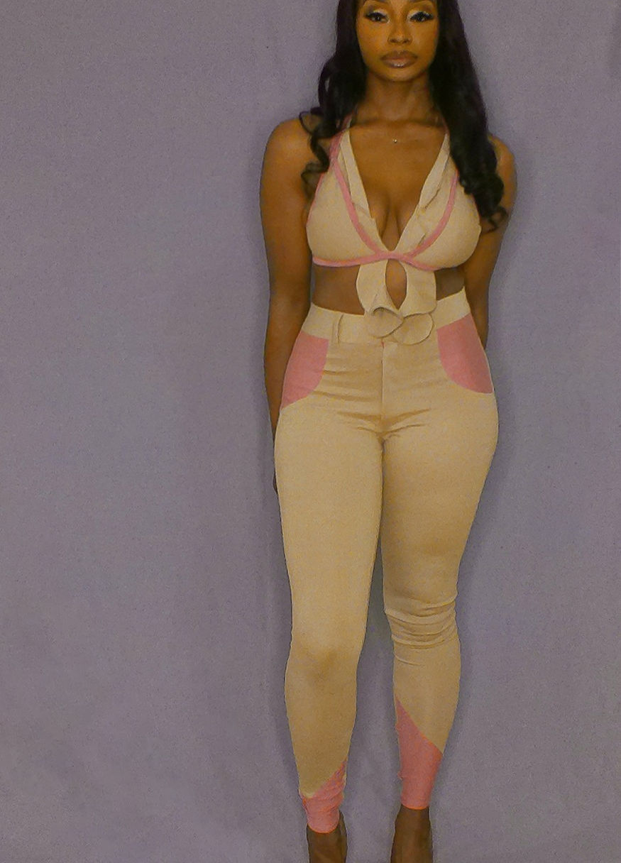pants: taupe-colored pants with zipper and snap closure. Accents include taupe colored belt loop, pink front pockets (nonfunctional), pink back pockets (functional), and pink geometric detail at lower hem of pant.